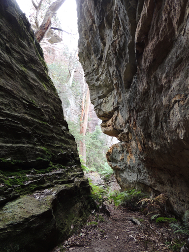 Is an unbelievable slot partly seen from the Ultimate View which gives access to the eastern side of Airly, from the headwaters of Dog Trap Creek and Glen Davis Road to the top of the cliff line. Located 300 m south east of Genowlan Trig. This almost 100 m high slot (no ropes required) was named by Daryl Watson on a Bush Club walk, 10th August 2015.