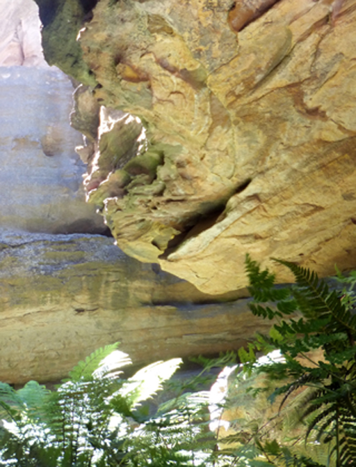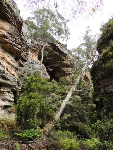 is located on one of the western tributaries of Glen Day Gully 2 km south, south west of Newnes. Midway along the gully, when descending, you enter a shallow constriction, which quickly becomes deeper and deeper. In a few more minutes, after carefully negotiating a 2.5 m drop, you enter a small, very dry canyon, with deeply eroded walls, only about half a metre apart, covered in green moss. A couple of metres later, the walls, now over 20 m high, open up to a magnificent overhang on the right-hand side, some 30 m long and 6-7m deep. Here, the ‘room’ is sufficient to accommodate several Coachwood and Sassafras trees. The canyon continues until the second overhang of equal size to the first one, is reached. The constriction is about 250 m long. Named by Yuri Bolotin and Brian Fox on a bushwalk of 27 September 2019.